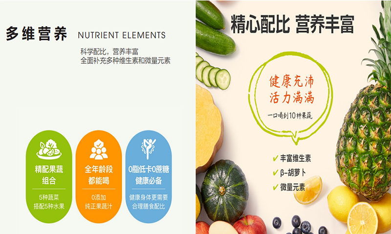 研究表明水果蔬菜是人體補充營養成分,保持健康必不可少的組成部分。蔬果汁一直以來都是以健康為賣點,旨在幫助飲食缺乏蔬果的人補充缺乏的養分。以市售蔬果汁來看,大多能補充茄紅素、β-胡蘿蔔素、鐵、鈣、鉀等成分。